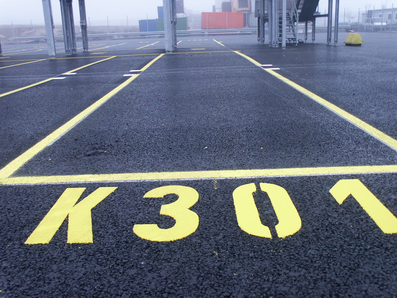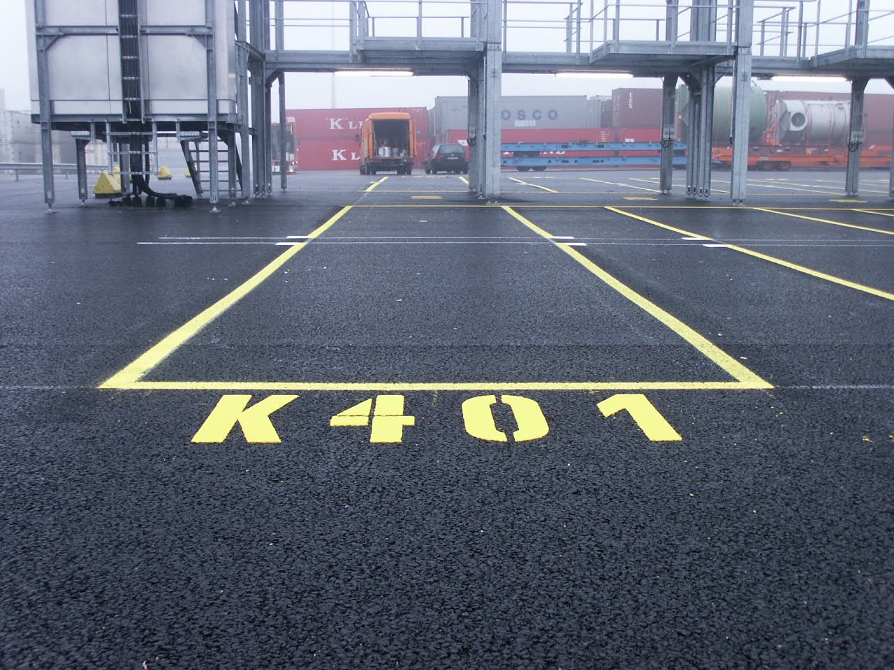 Hierbei handelt es sich um Markierungen für Straßen und Wege auf Ihrem Werksgelände. Dazu zählen beispielsweise sowohl verkehrsführende als auch warnende Markierungen aller Art, Parkplatzanlagen, Wartespuren für Lieferantenfahrzeuge, Sperrflächen auf Kai-Anlagen in Hafengebieten, Containerstellflächen, Flughafenmarkierungen auf Start- und Landebahnen, usw.. Dies sind nur einige Möglichkeiten.